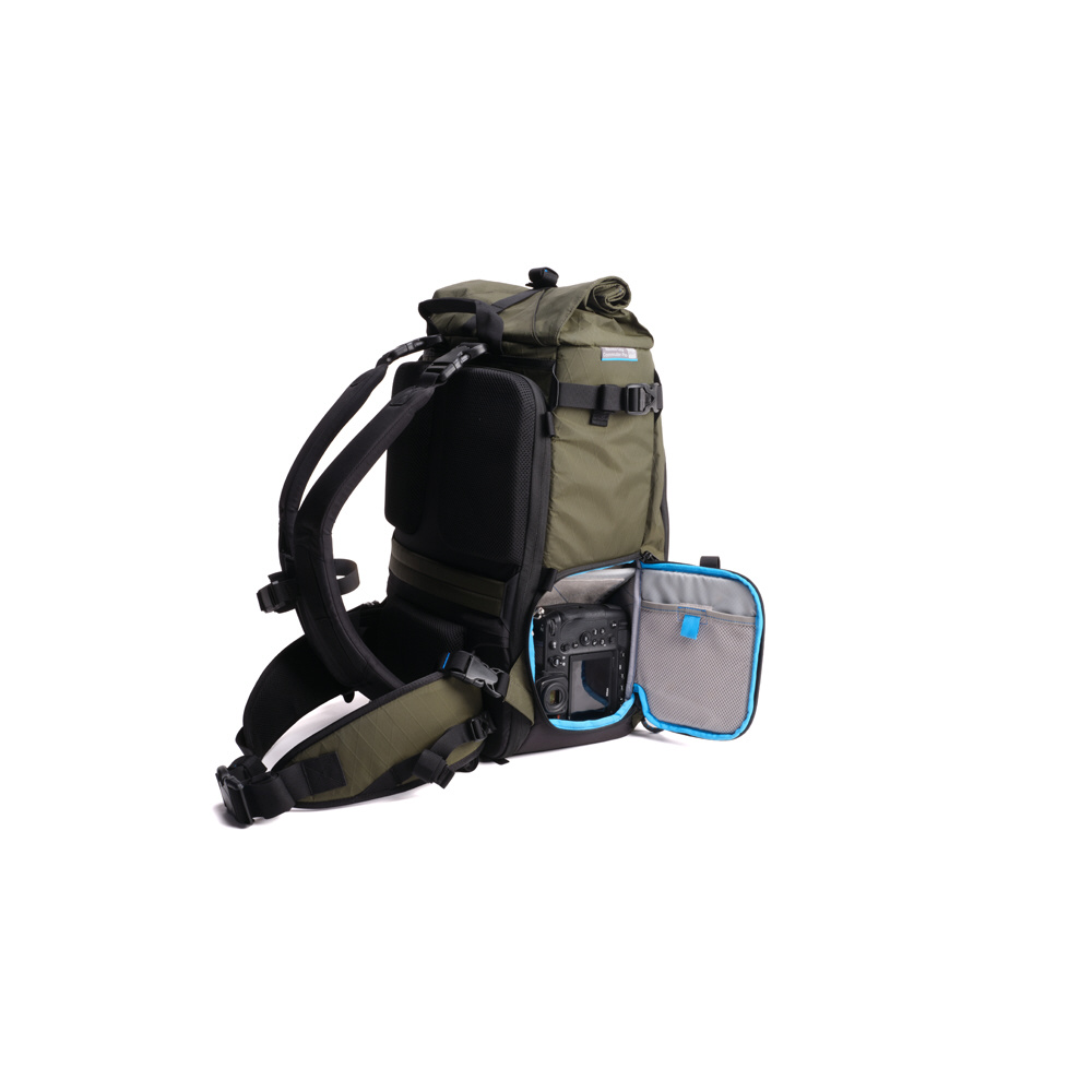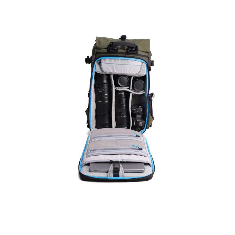 上部がロールトップ型の多くの収納スペースを必要とするフォトグラファーのためのカメラバックパックです。大型の機材のほか毎日の必需品も快適に持ち運ぶことができます。