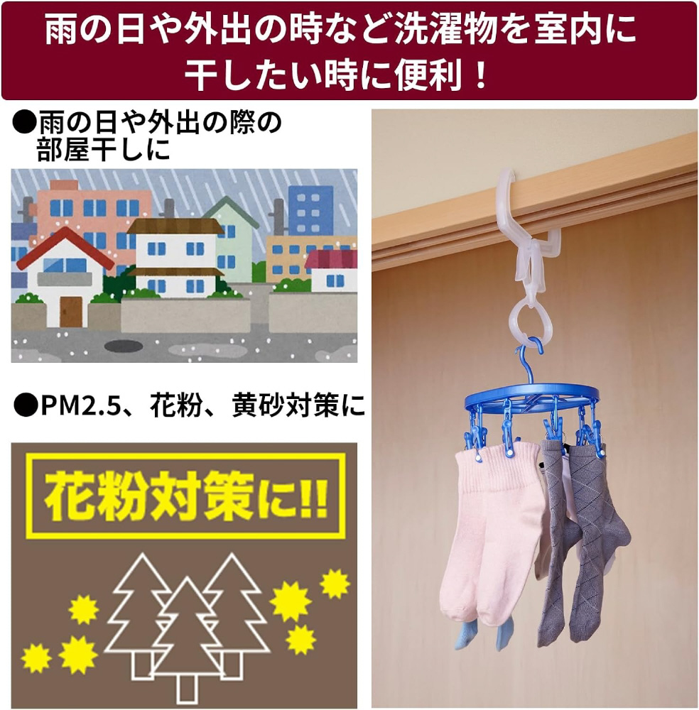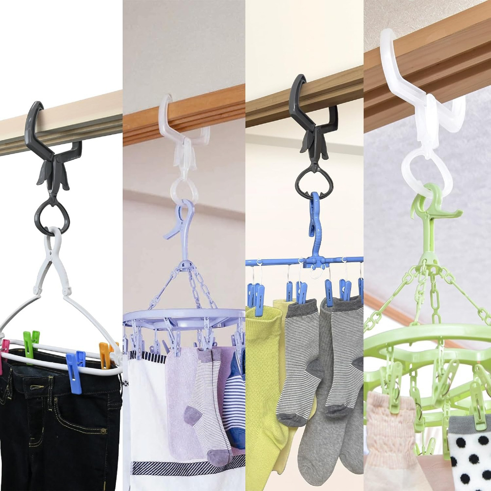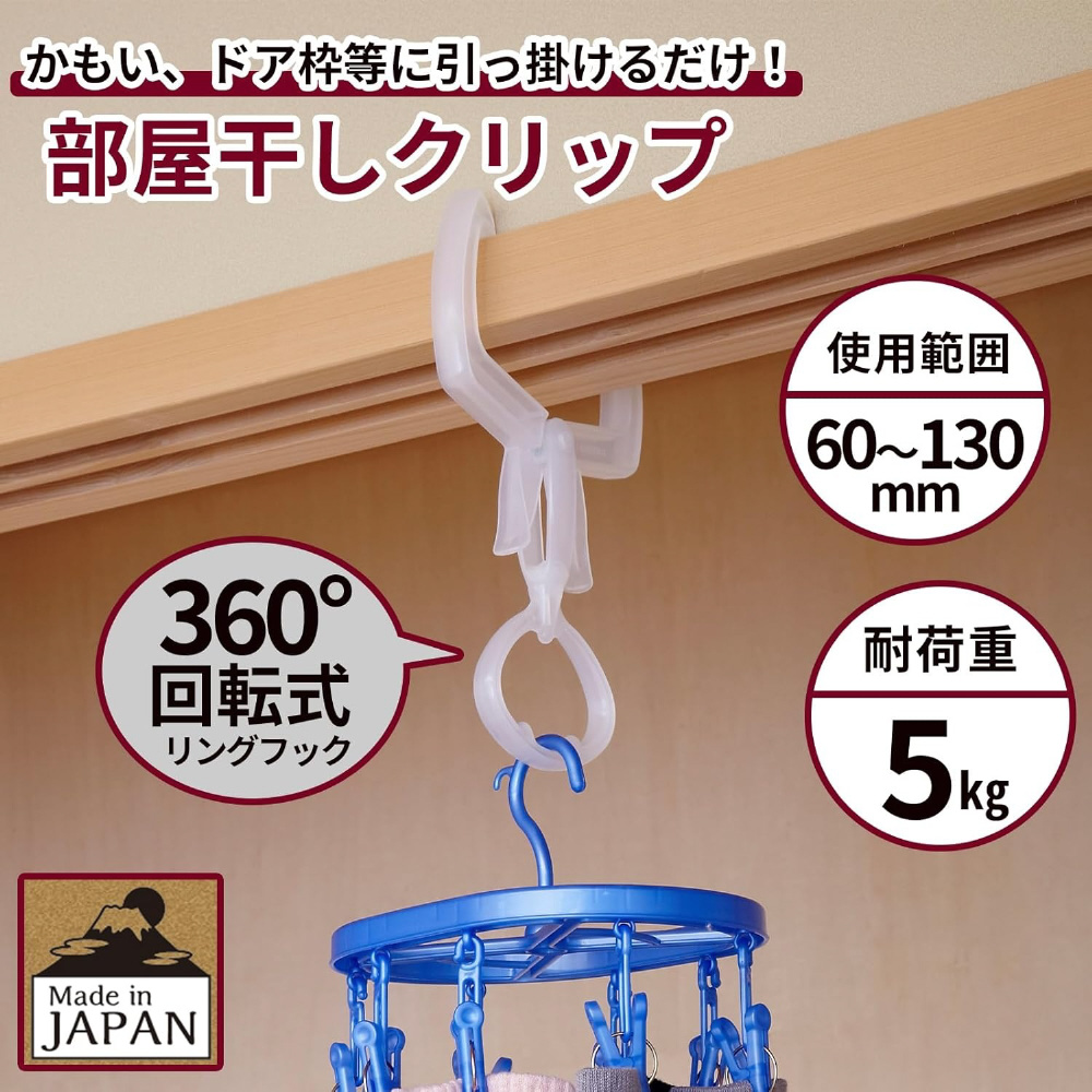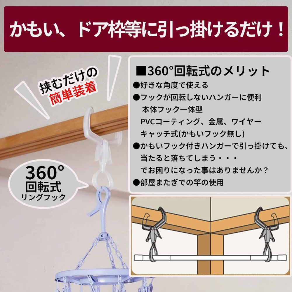 部屋干し簡単便利アイテム。ポールも使える360°回転式リングフック。かもい、ドア枠に挟むだけ。花粉・黄砂・PM2.5対策に。雨の日、外出時の部屋干しに。