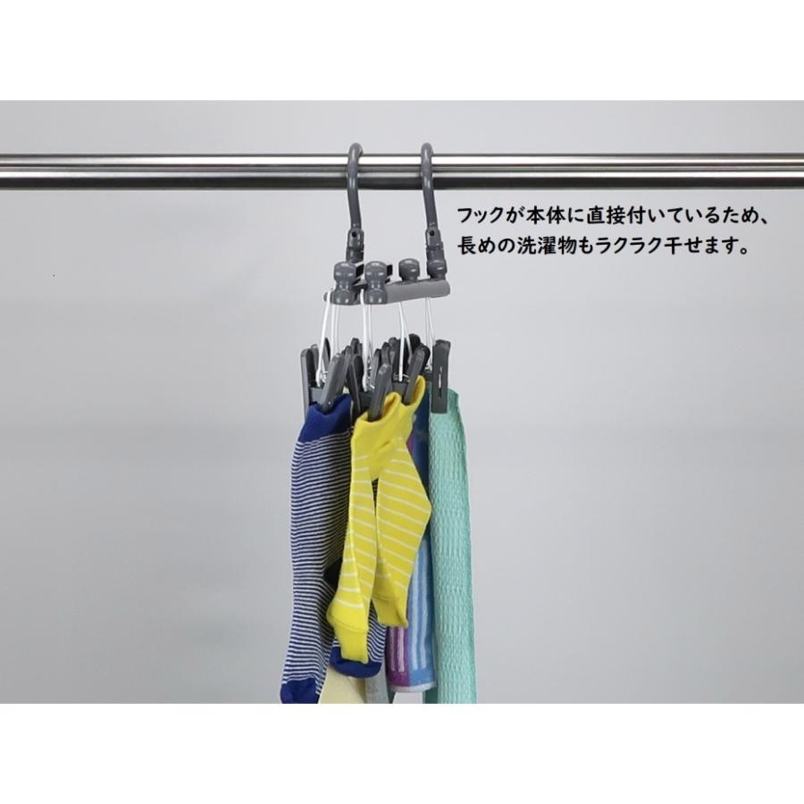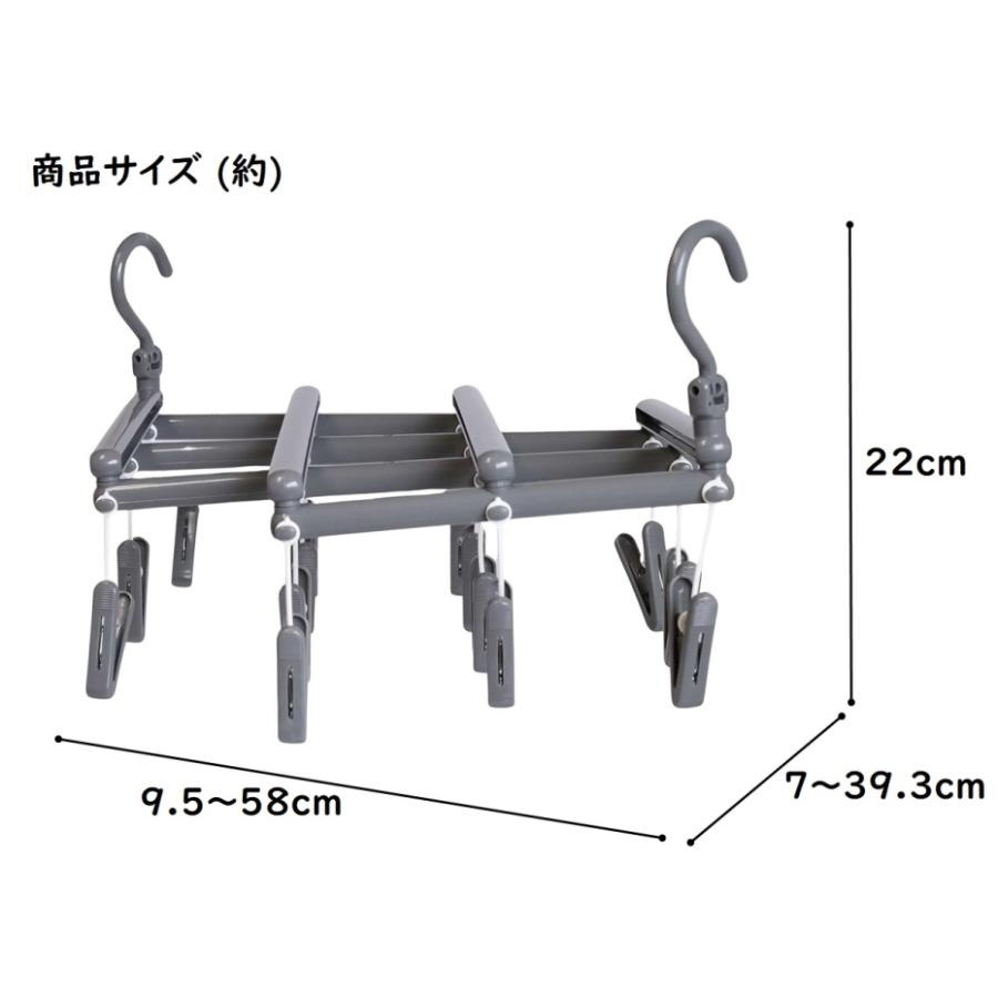 スペースに合わせて伸びたり縮んだり、ムダなく干せる。干す場所、干す物に対応。伸縮自在。長ーく使って小さく収納。短いフックで竿にしっかり固定。低竿対応、長めの洗濯物も干しやすい。部屋干し小物干し向けの14ピンチ。