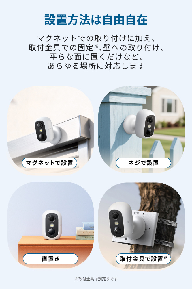 マグネットなら屋外・屋内問わずどんな場所でも簡単に設置でき、手軽に防犯対策ができます。取付金具での固定※、壁への取り付け、直置きなど様々な設置方法があります。※取付金具は別売りです