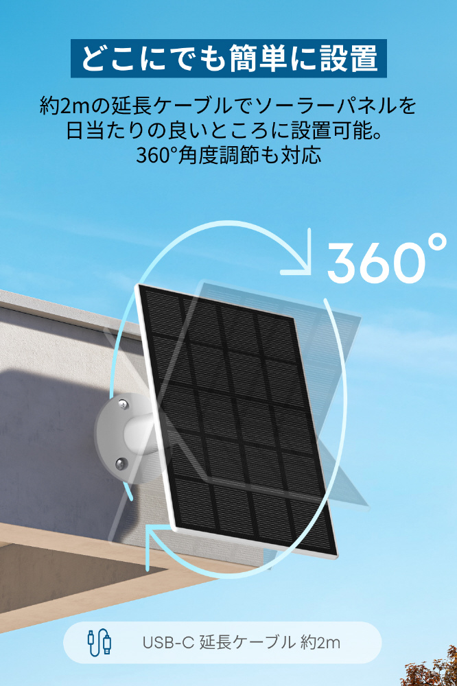 約2mの延長ケーブルで、ソーラーパネルを日当たりの良いところに設置可能。360°の自由な角度調節も対応。
