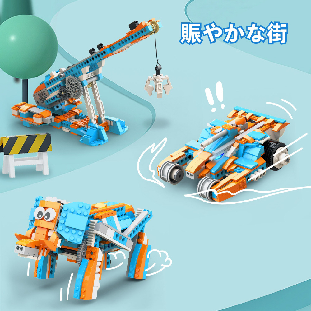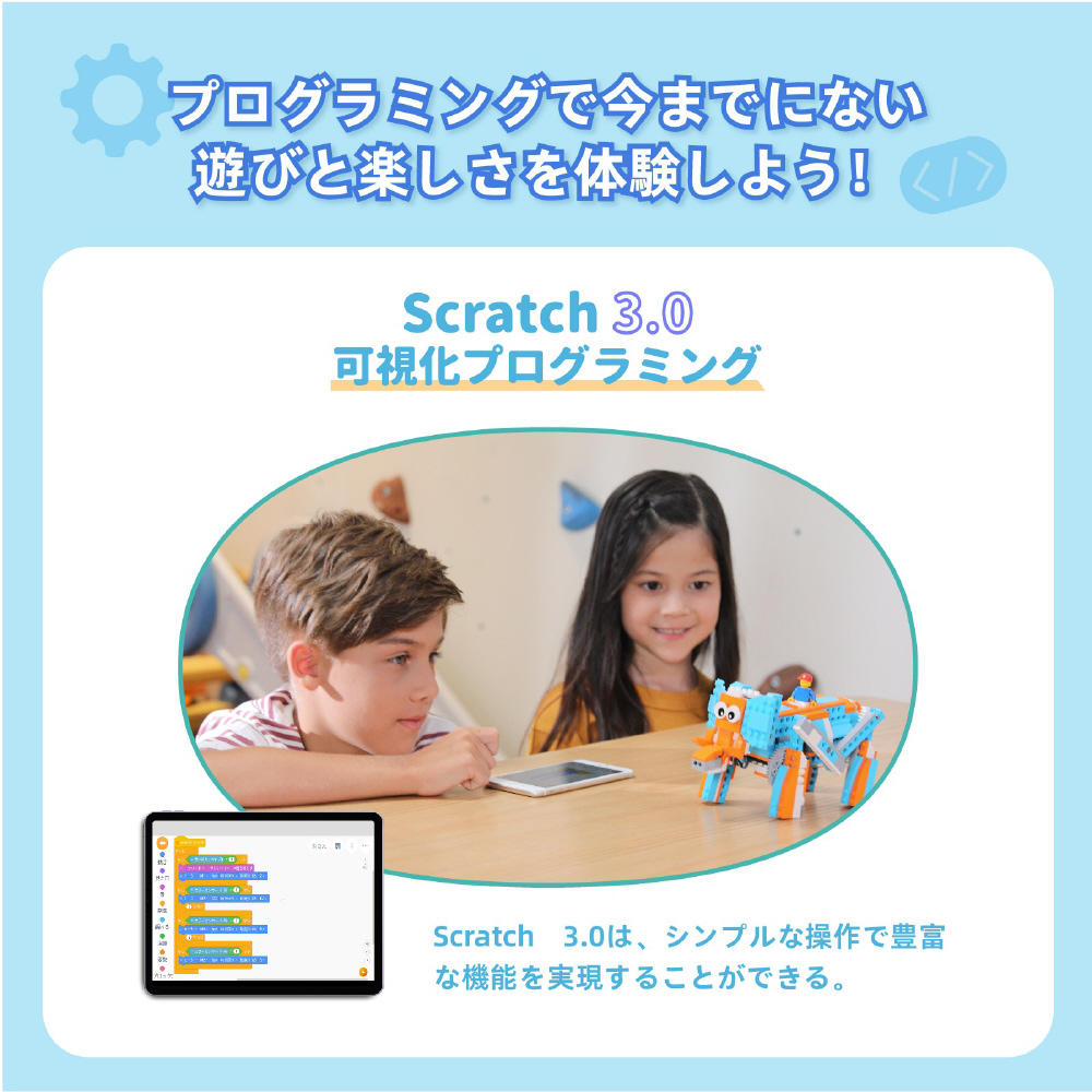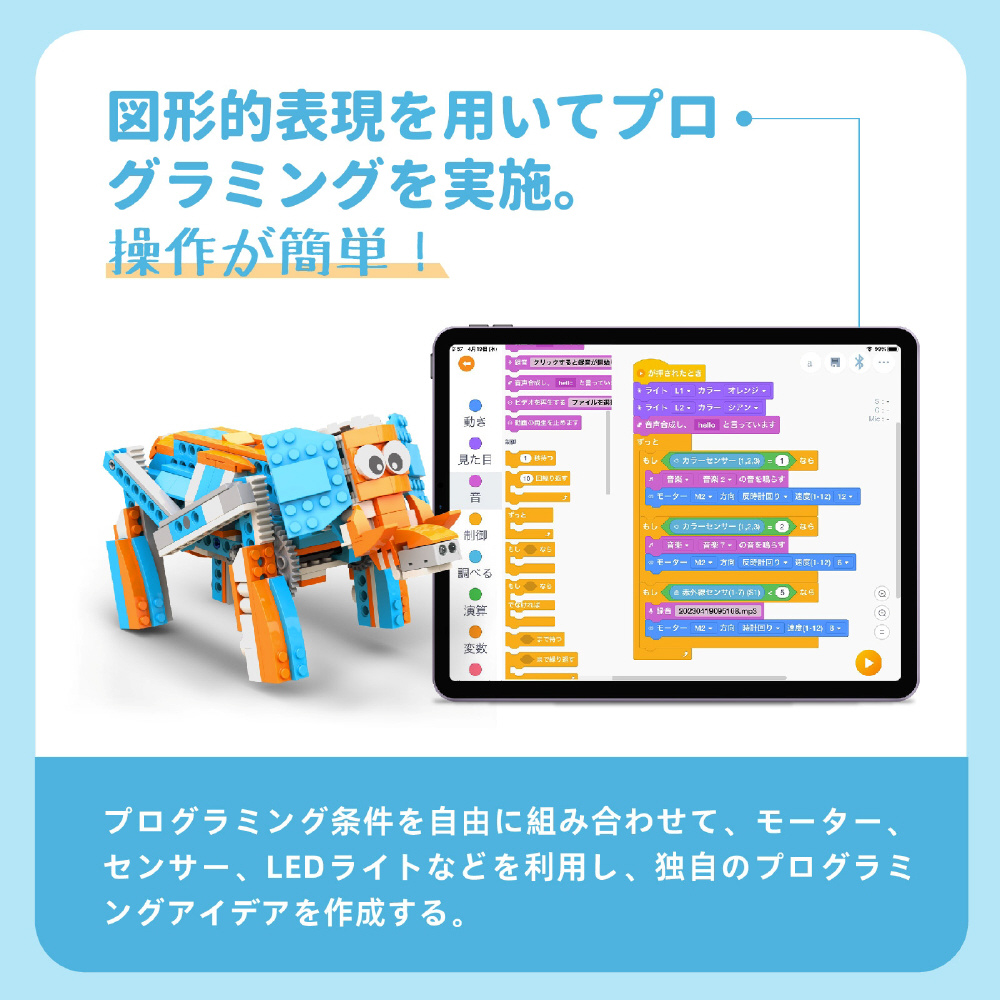 ブロックを組み立ててで飛行機やゾウ、ロボットなど10種類のマシンを作り、プログラミングアプリで思いのままに動かそう!