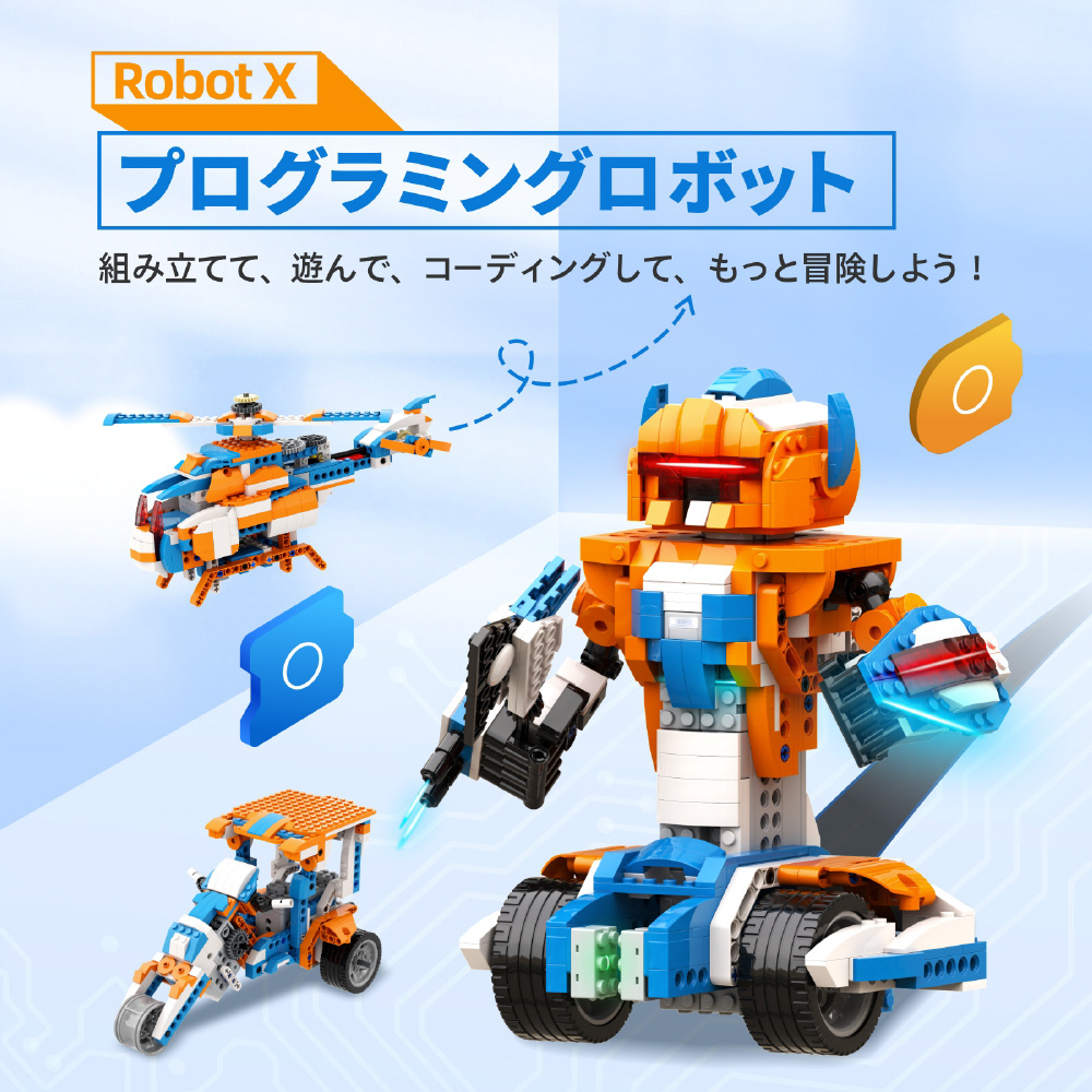 Robot X プログラミング ロボットは600個のブロッと3つのモーター、3つのセンサー、2つのLEDライトを使って、12種のモデルを組み立てて遊ぶブロックタイプの玩具です。