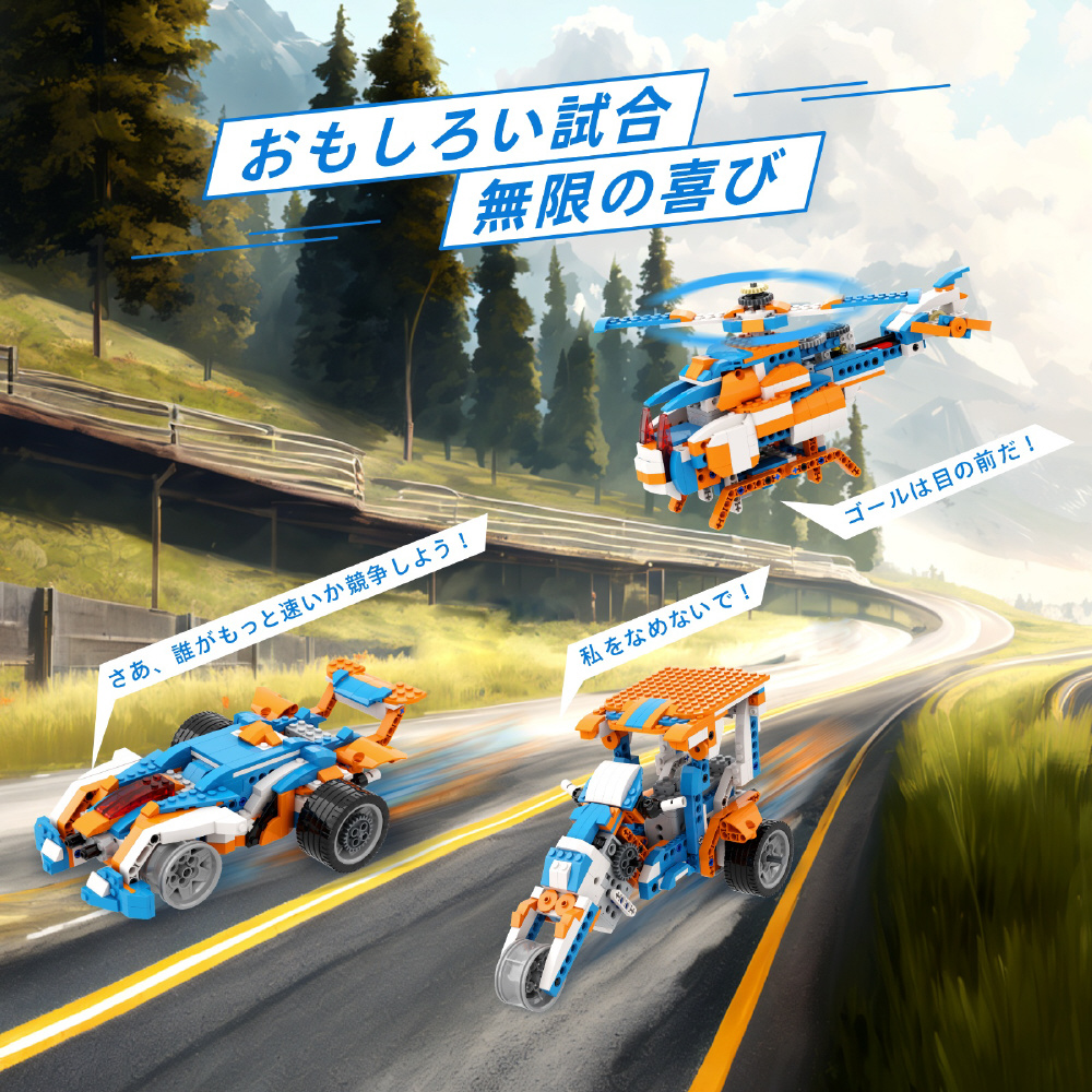 ブロックを組み立ててロボットやレーシングカー、ヘリコプター、楽器、ドローイングマシンなど12種類のマシンを作り、プログラミングアプリで思いのままに動かそう!