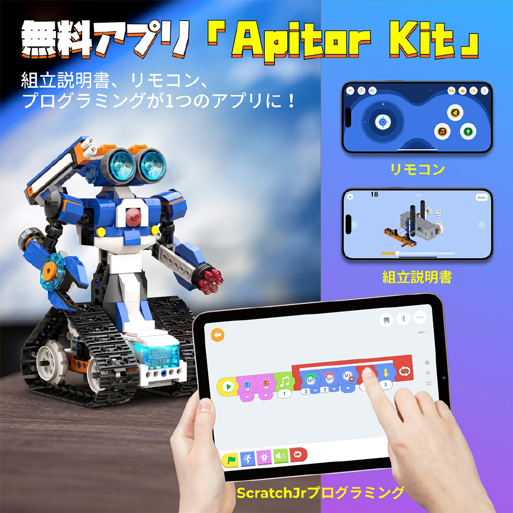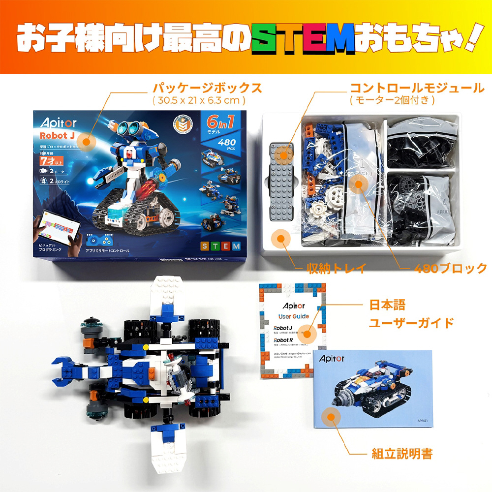Robot J 6 in 1アピターロボット。プログラミングスキルが身につく、遊びと学びが一つになった知育玩具です。お持ちのスマホやタブレットが操作デバイスとコントローラーに。アプリをダウンロードして準備完了。ブロックで宇宙ロボットや火星探査車などを組立てよう。プログラミングか、スマホでラジコンのように操作しよう。学校でも使われるアプリScratchを使用。遊び方が無限に広がり、好奇心と想像力を刺激します。