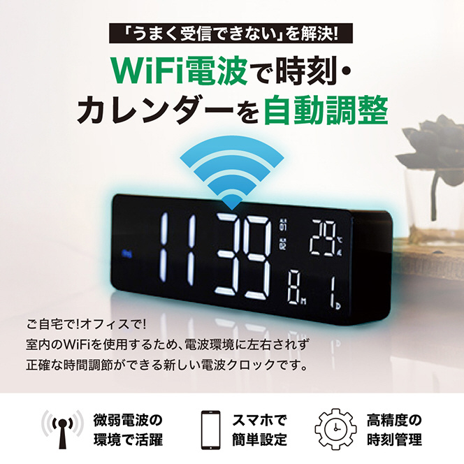 Wi-Fi自動調整機能搭載モデル。無線LAN(2.4GHz)を使用して時刻カレンダーを自動調整します。
