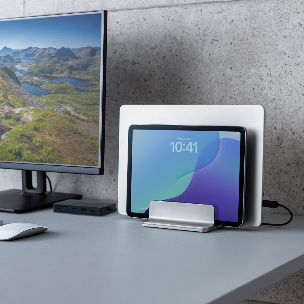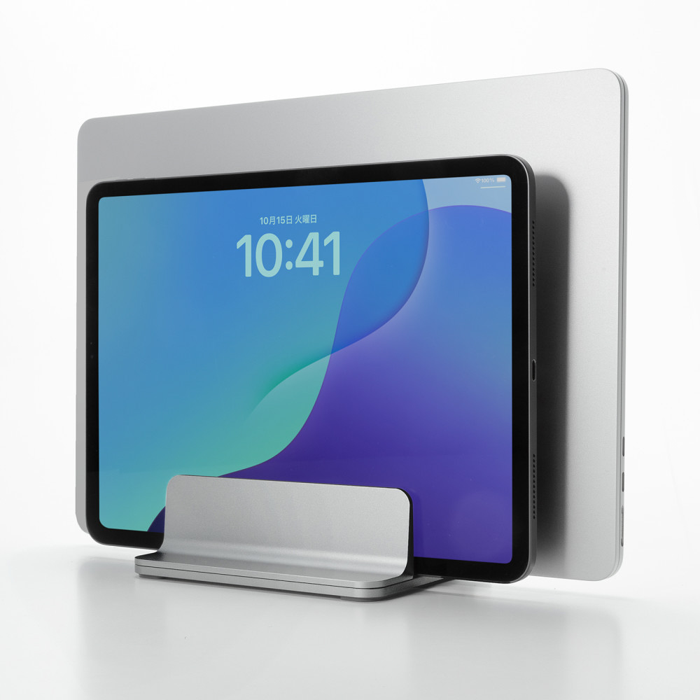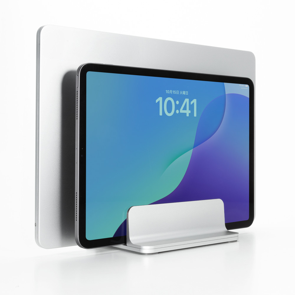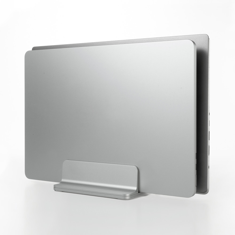 ■ノートパソコンの画面を閉じて外部ディスプレイと接続する「クラムシェルモード」での使用に最適な縦置きタイプのアルミスタンドです。