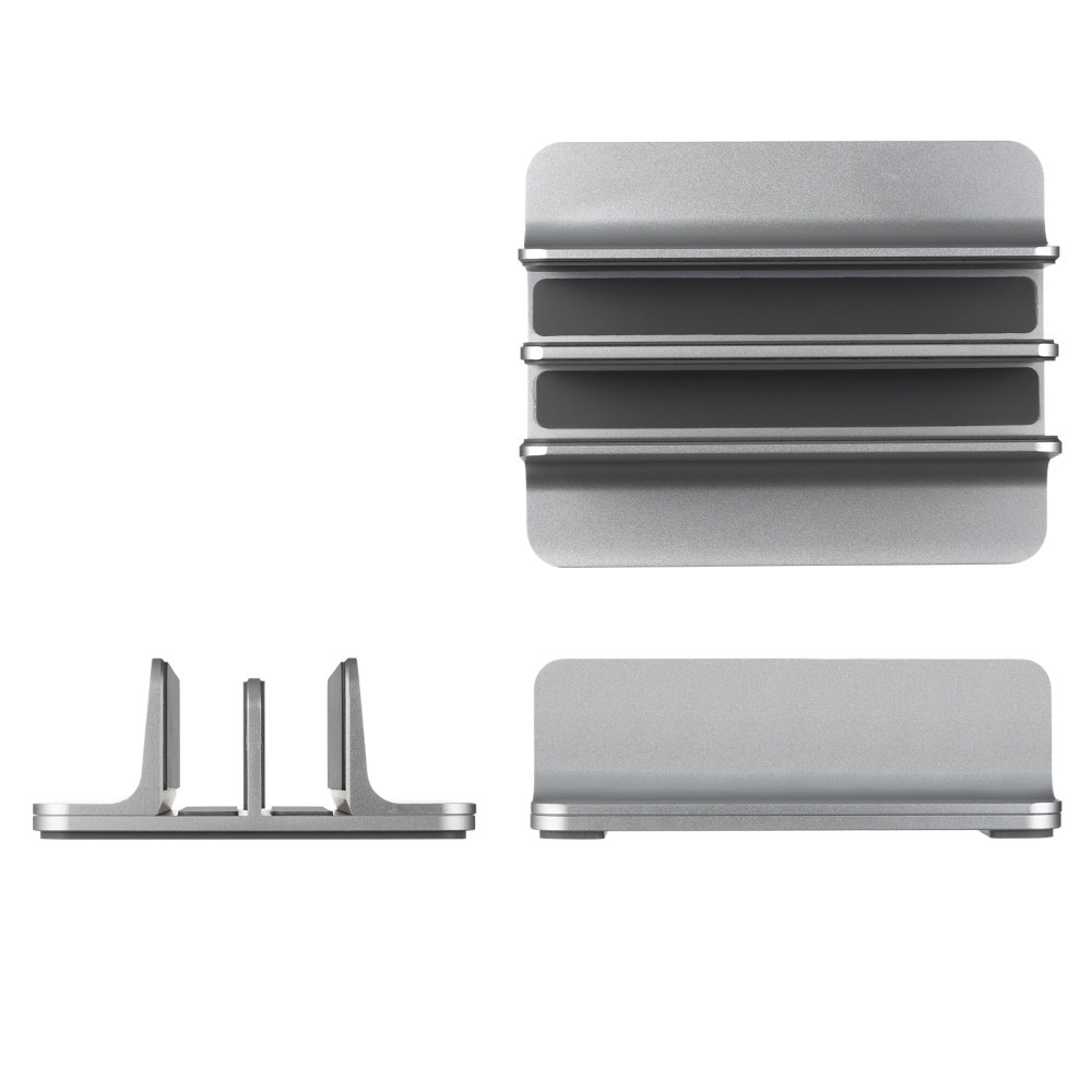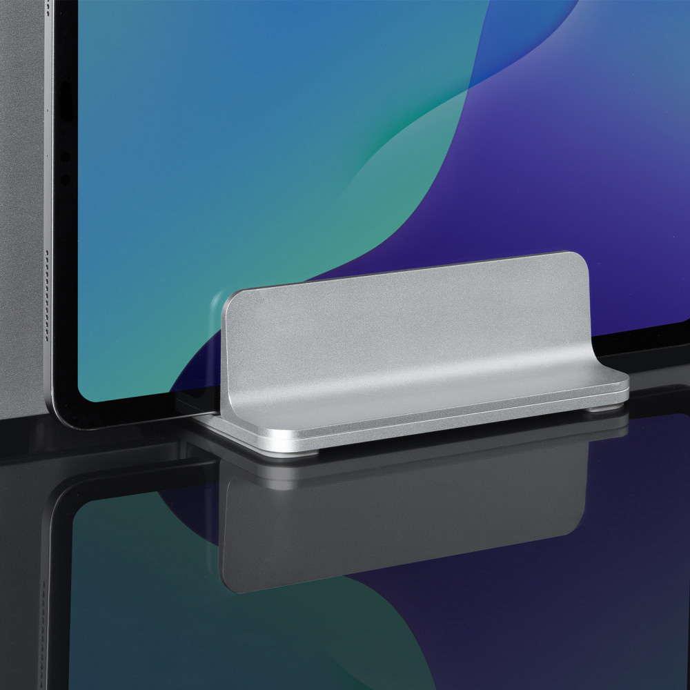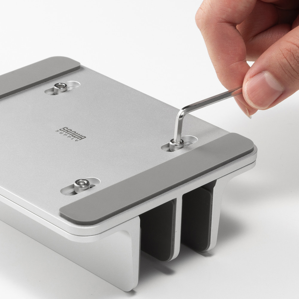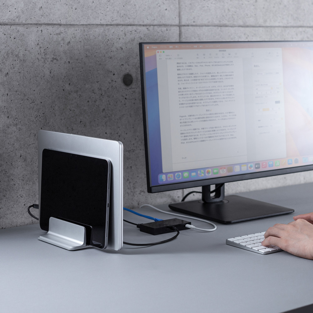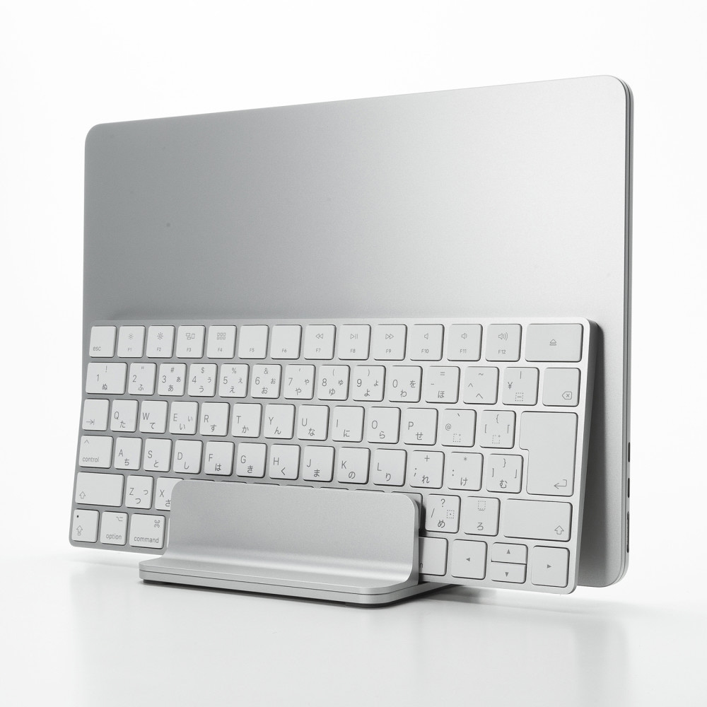 ■ノートパソコンの画面を閉じて外部ディスプレイと接続する「クラムシェルモード」での使用に最適な縦置きタイプのアルミスタンドです。
