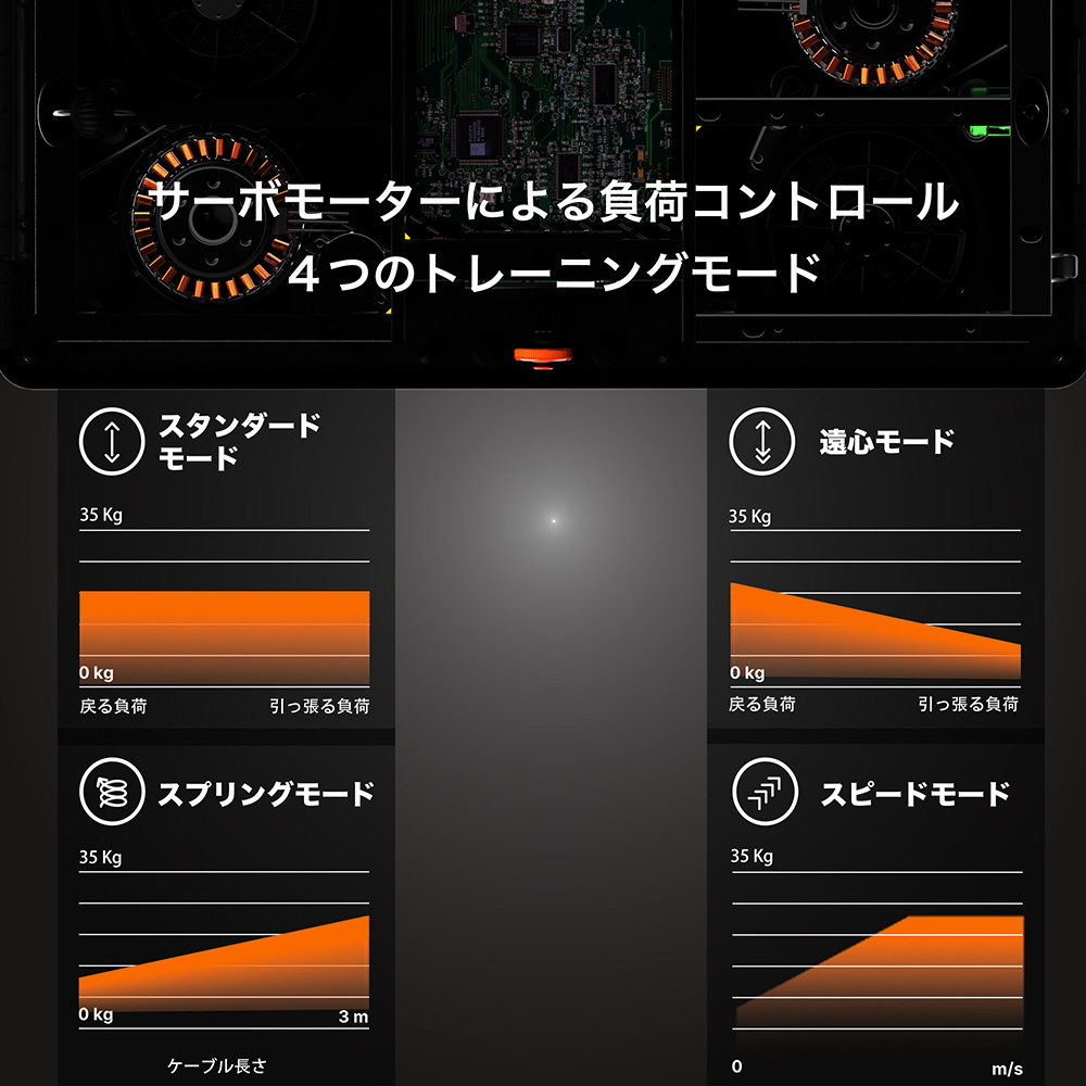 サーボモーターにより、負荷を引き起こす。ダンベル、バーベル、ケーブルの機能を一台に備える。負荷が1Kg単位で調整可能。
