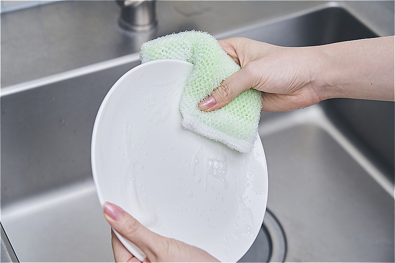 洗剤の泡がたくさんの小さな穴からあふれだす食器洗い用スポンジ。