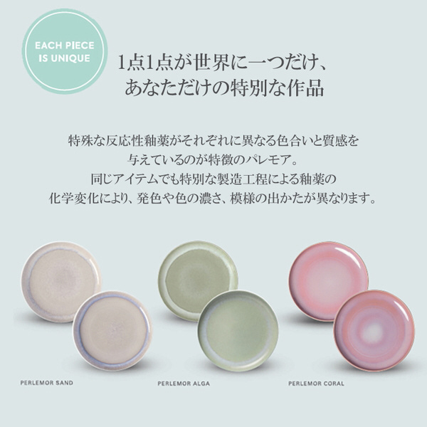 特殊な反応性釉薬がそれぞれに異なる色合いと質感を与えているのが特徴の「パレモア」。