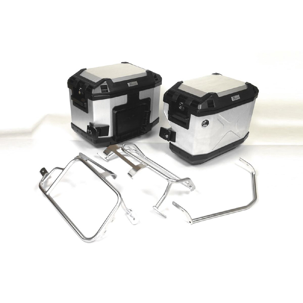 エクスプローラーカットアウトは、右側サイレンサー部分との干渉を逃がしながら左右対称幅となるようカットアウトを施したエクスプローラーサイドボックスとサイドケースキャリアをセットにした特別モデル。片側のみ配置されるサイレンサーに対し、左右サイドボックスを取り付けた際の幅の差を無くし、バランスの良いスタイルを保つことができます。エクスプローラーシルバーSC37&40と専用ステンレスキャリアのセットです。※左側SC40(40L)、右側SC37(37L)