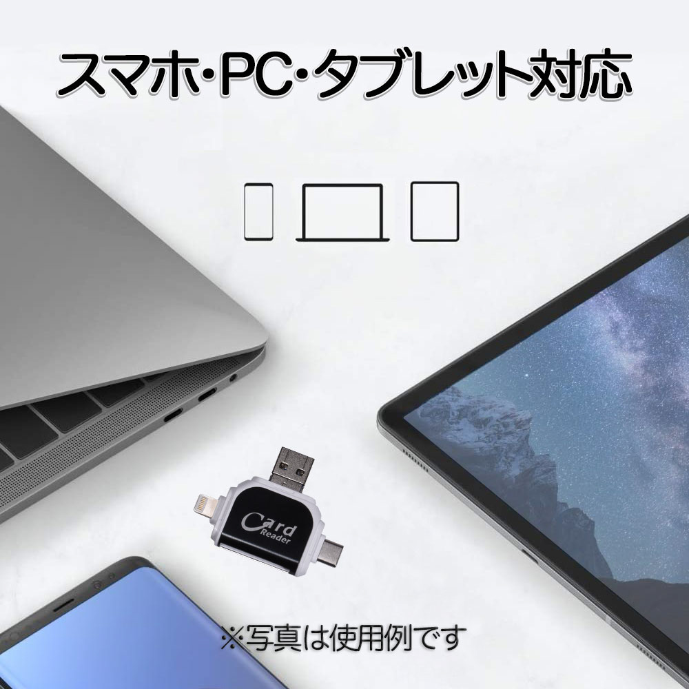 Lightning/USB-C(Type-C)/microUSB/USB-Aを搭載した4-in-1モデル。スマートフォン、タブレット、パソコンが上記いずれかの端子に対応していれば、メモリーカード内の写真・動画・書類ファイルを簡単に取り込みできます。