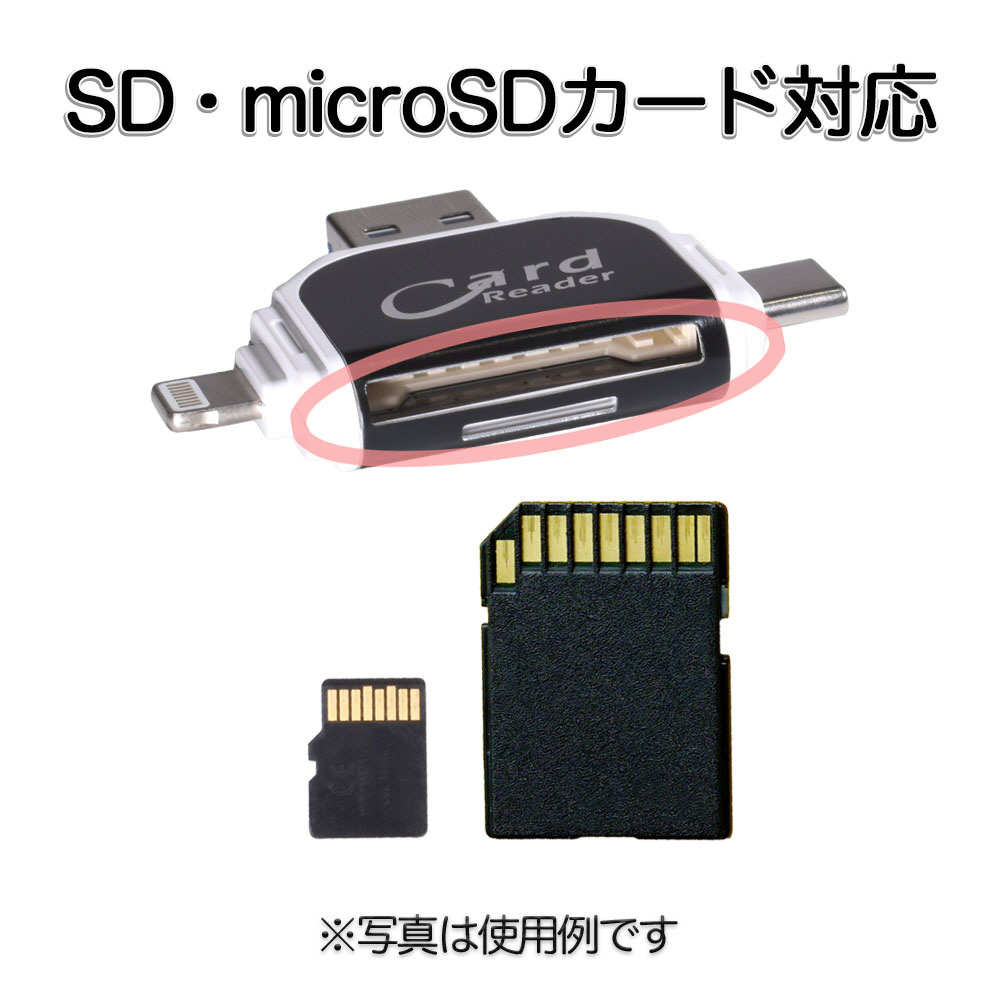 MicroSD/SDカード対応の4-in-1カードリーダー。Lightning/USB-C/microUSB/USB-Aの4種類の端子を搭載し、スマホ・タブレット・PCに幅広く対応。写真・動画の取り込みやデータ移行が簡単に行える高速・多機能モデルです。
