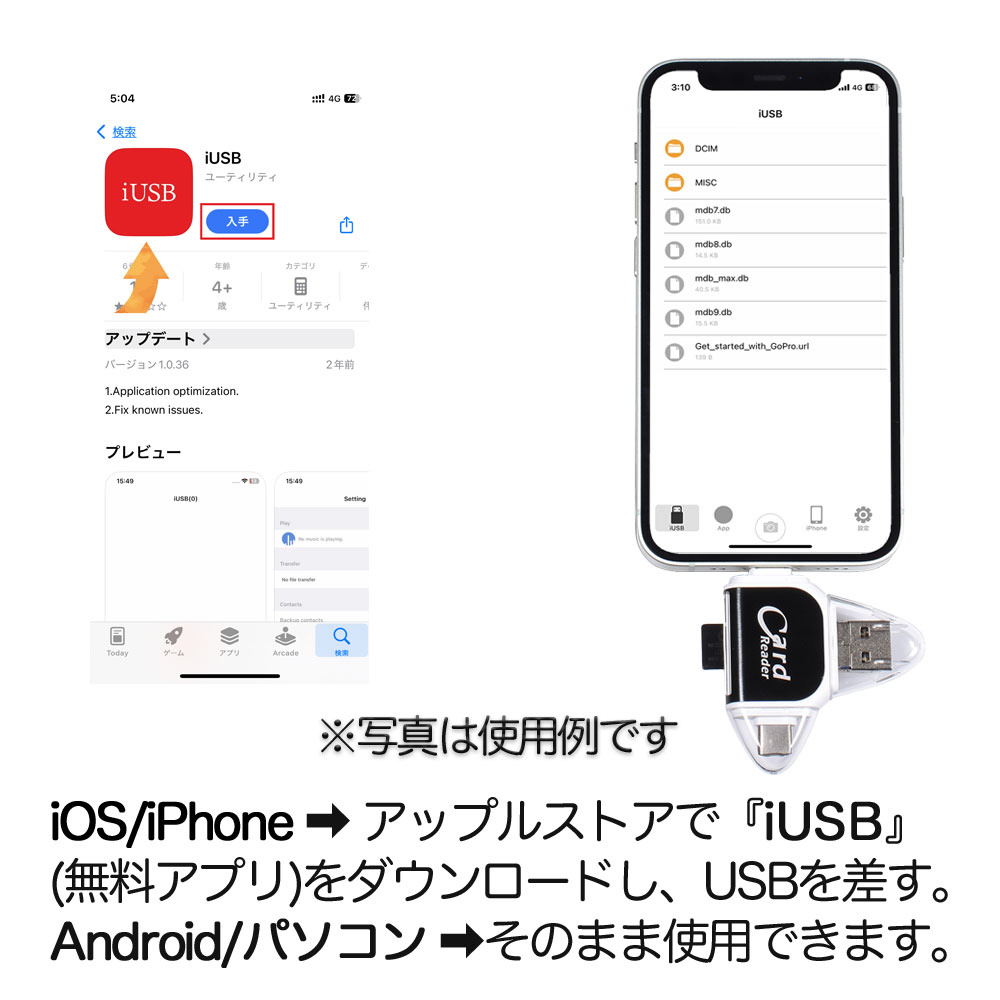 無料アプリ『iUSB』(App Store)をインストールし、端末に接続するだけで使用できます。初回インストール後はUSBを挿すだけでアプリが自動起動します。