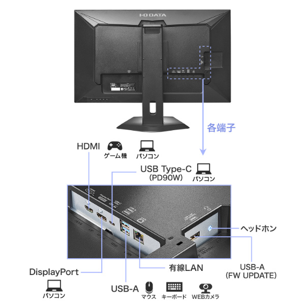 その他、HDMI、DisplayPortを搭載しているので、幅広い機器をつないでご利用いただけます。