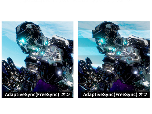 ■AdaptiveSync(FreeSync)に対応。画面のリフレッシュレートとコンテンツのフレームレートのズレから生じるティアリングを防ぎ、滑らかで美しい映像を実現します。また、長時間使用時に眼に優しいフリッカーフリー(ちらつき軽減)、ブルーライト軽減モードを搭載します。