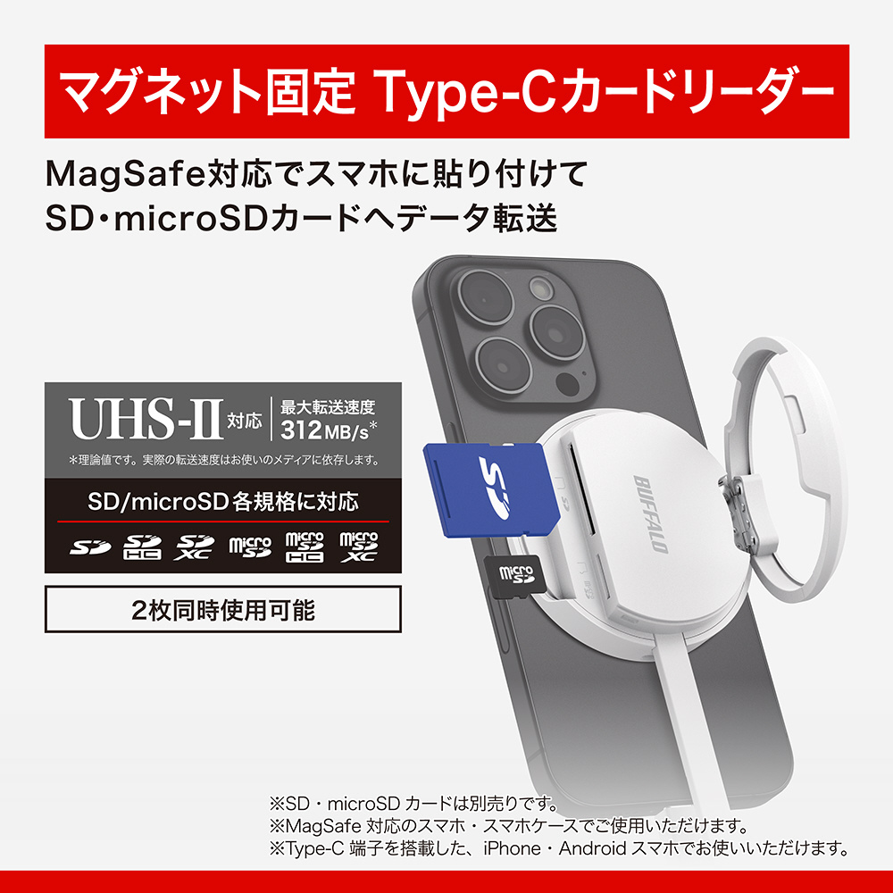 MagSafe対応でスマートフォンに磁力でピタッとくっつけることができ、持ち運びに便利なカードリーダー