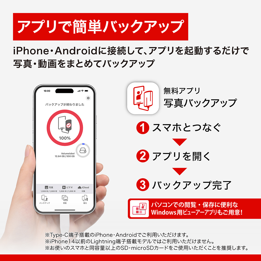 スマホのUSB-C端子に接続するだけで、写真やビデオをSD/microSD(いずれも別売)へスムーズにバックアップ。「写真バックアップ」アプリなら、保存したデータの閲覧や復元もかんたんに行えます。