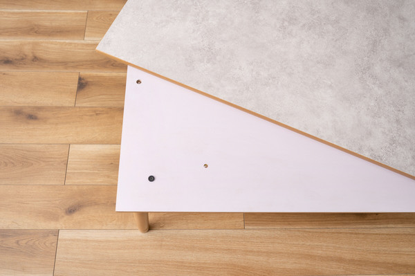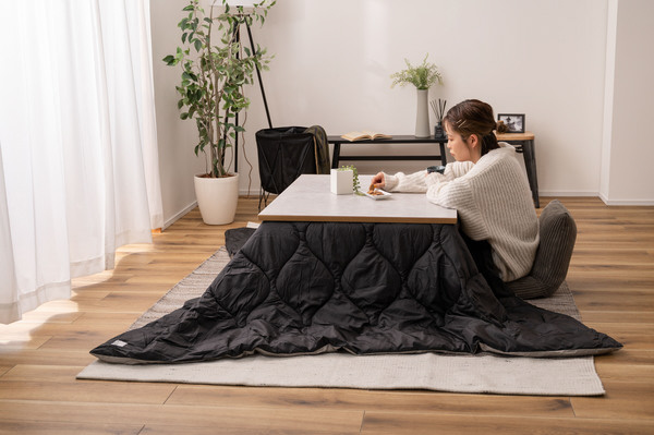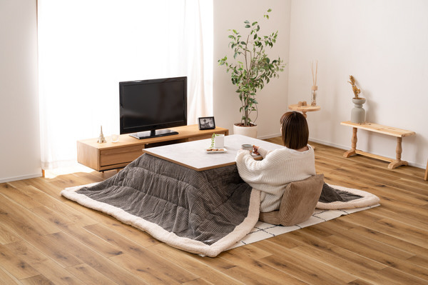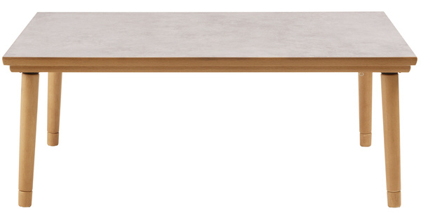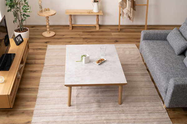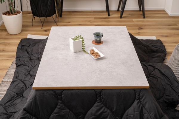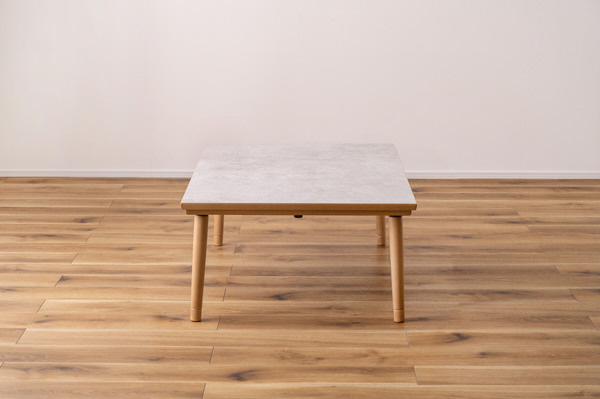 大理石調のストーン柄の天板とナチュラルな木目の組み合わせたフラットヒーターコタツ。