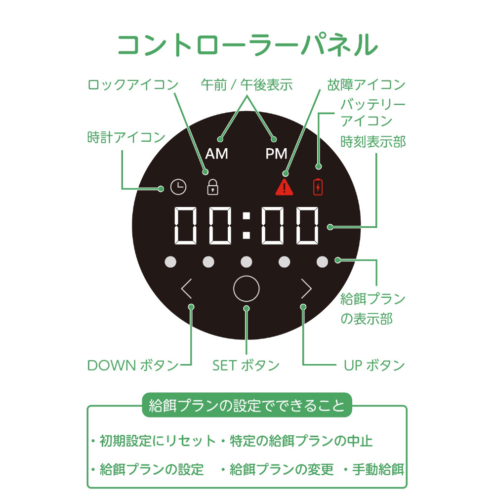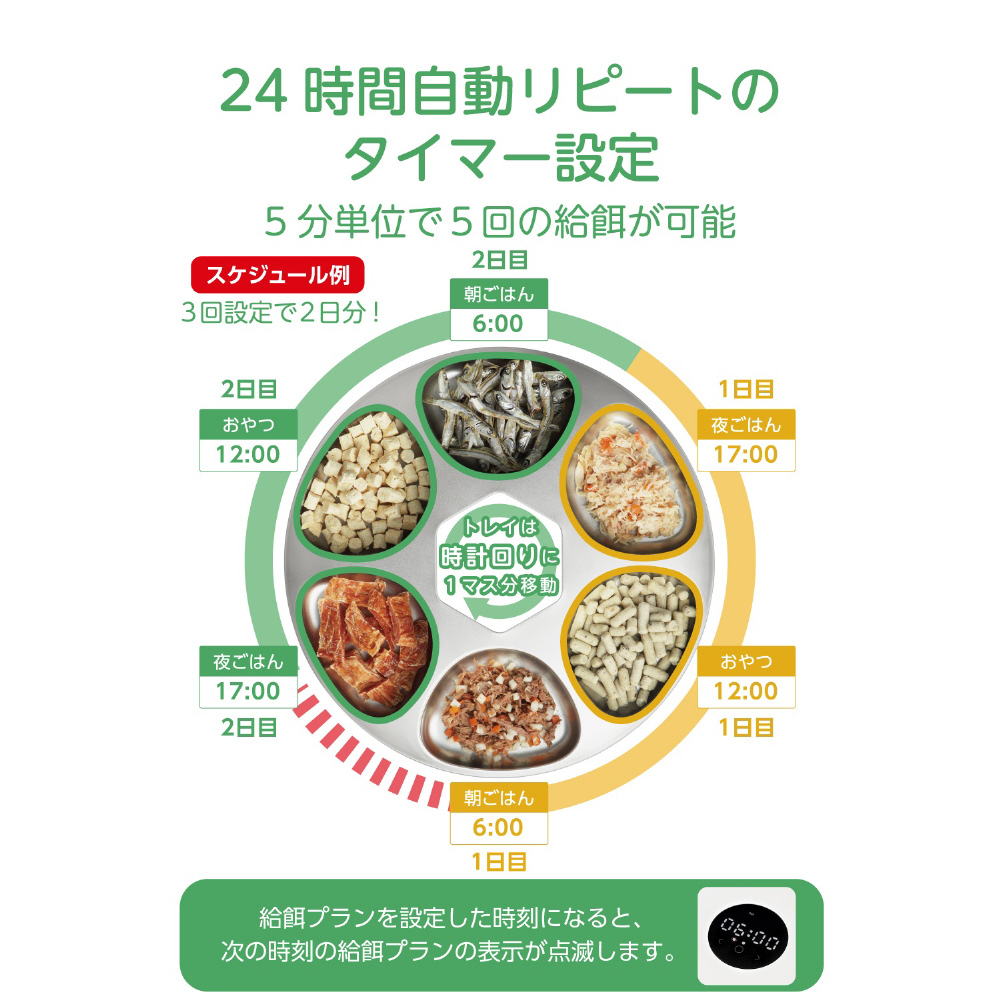 タイマーは5分単位で設定でき、最大5回給餌が可能。24時間サイクルで繰り返すので、毎日の食事管理も安心です。