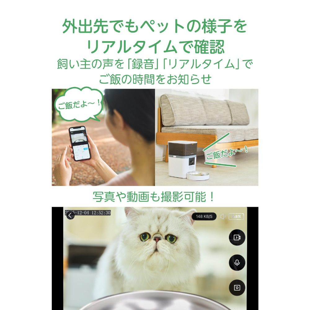 飼い主の留守中も見守れて安心!スマホアプリからリアルタイムで、愛犬・愛猫の様子を確認できるカメラ付き自動給餌器です。ごはんの量や回数を細かく設定でき、外出中でも規則正しい食生活をサポートします。約4Lの大容量タンクで、不在が続くときもごはんをたっぷりストックできます。