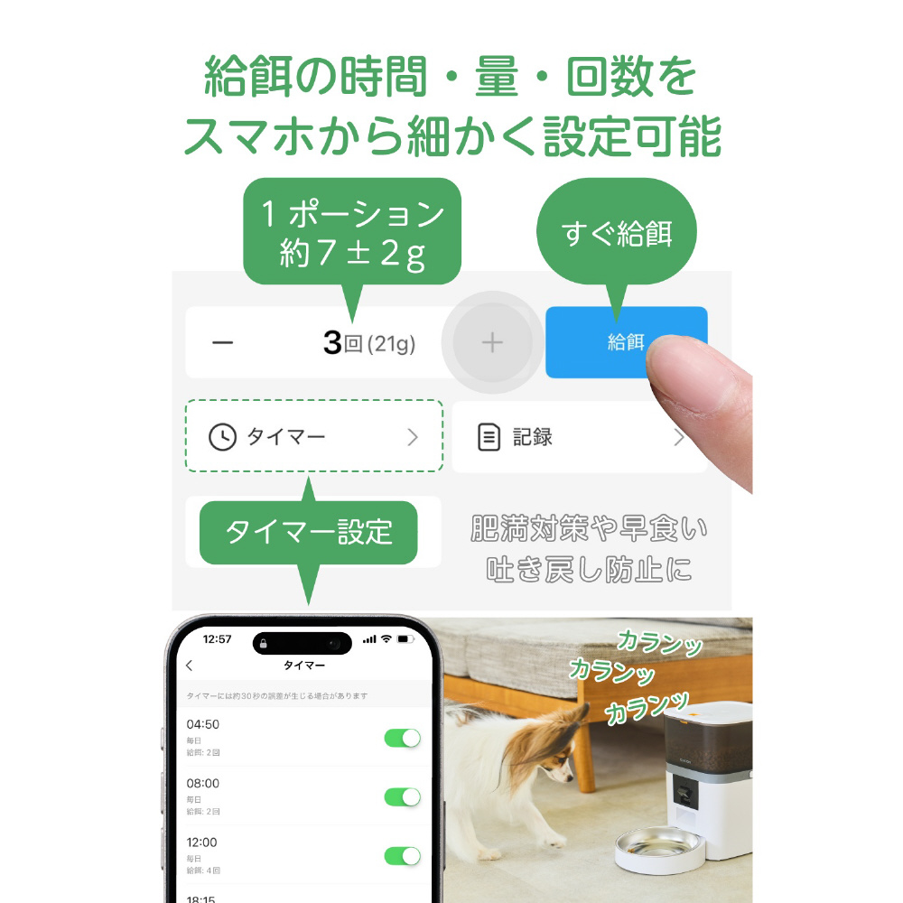 給餌の時間・量・回数をスマホアプリから細かく設定可能。フードを約7g単位で小分けに設定でき、愛犬・愛猫のちょうどいい量を出せるので、肥満対策や早食い・吐き戻し防止に役立ちます。