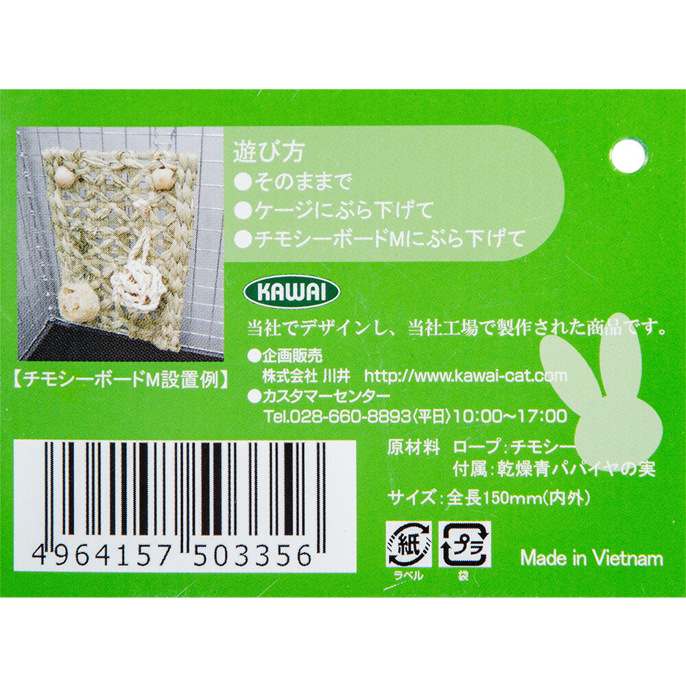 ●ケージやチモシーボードMにぶら下げて遊ばせることができます。