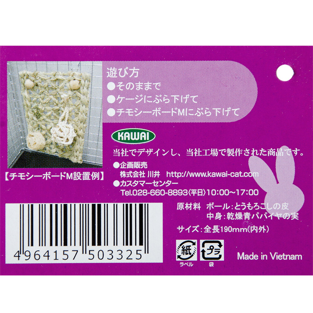 ●ケージやチモシーボードMにぶら下げて遊ばせることができます。