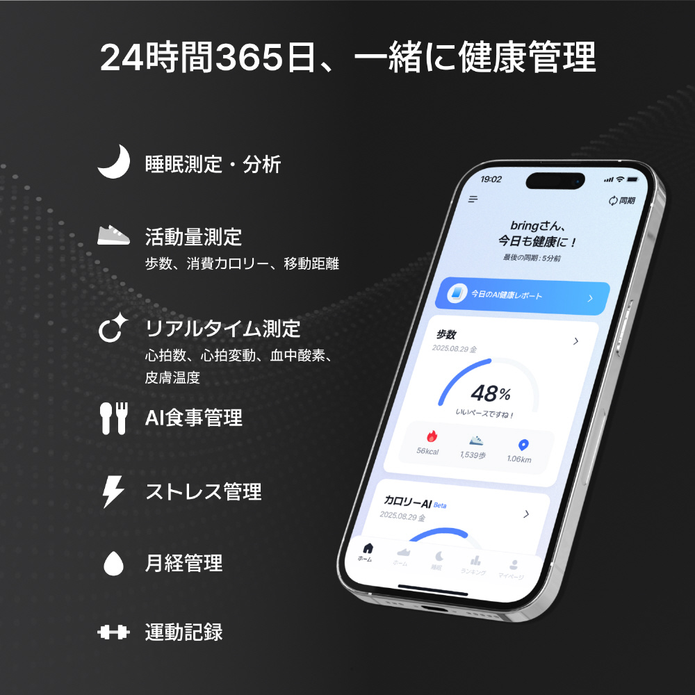 つけてるだけで生体情報を分析し毎日の健康をサポートするスマートリングです。日常生活に最適な着け心地とスタイリッシュなデザインが特徴です。リアルタイムで健康管理・・・ブリング専用アプリで心拍数、睡眠データ、運動データなどさまざまな健康データを一目で確認。いつでもどこでも、簡単に健康状態をチェック、管理できます。ブリングで手軽に健康的な毎日を築きましょう。