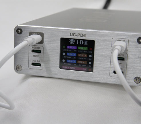 UC-PD6は、USB PD規格に対応したUSB Type-Cポートを6系統搭載した急速充電器です。トータルで最大440Wの高出力に対応し、USB PD対応のIDXバッテリーを最大6本まで同時に充電することができます。