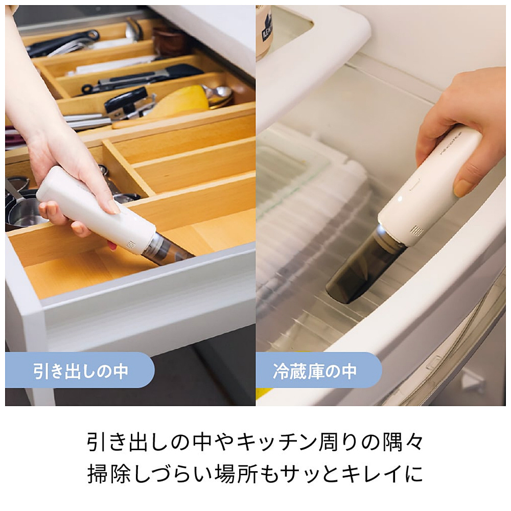 200g と軽量ながら、約2,000Pa(満充電時)とパワフルな吸引力。ホコリや食べかす、冷蔵庫の隅や髪の毛を吸うには十分な吸引力です。