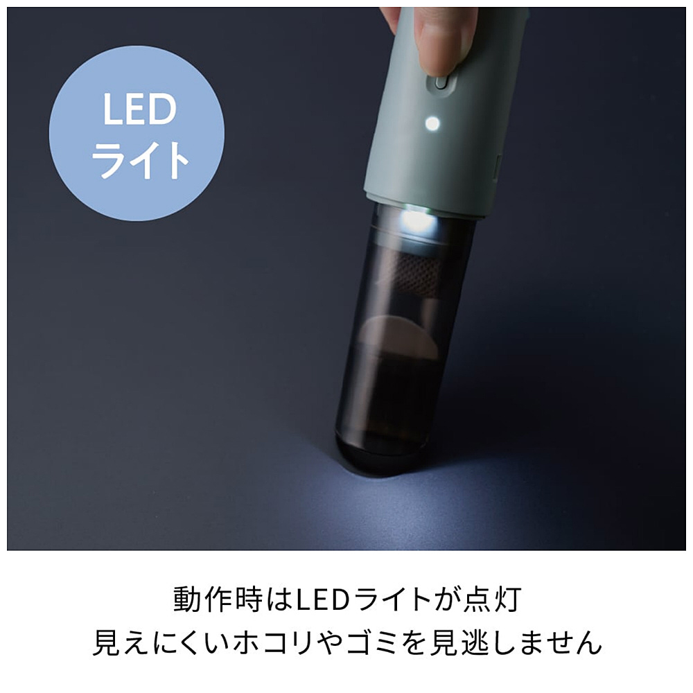 動作時にLED ライトが点灯するため、机の下などの暗いところでもゴミが見えやすく、簡単にお掃除することができます。