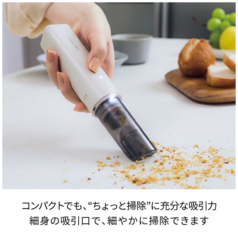 200g と軽量ながら、約2,000Pa(満充電時)とパワフルな吸引力。ホコリや食べかす、冷蔵庫の隅や髪の毛を吸うには十分な吸引力です。