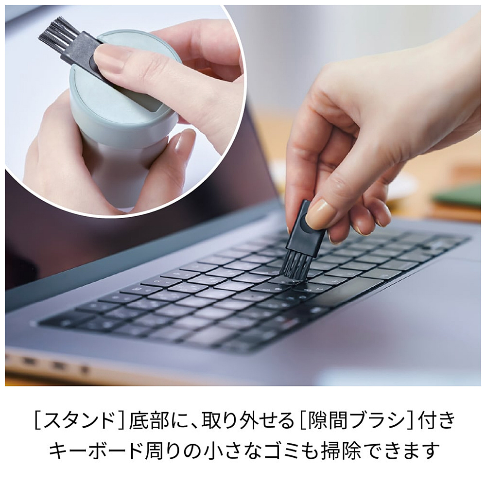 キャップ部分には、パソコンのキーボードや棚、床の隅のごみをかきだすのに便利な隙間ブラシ付き。