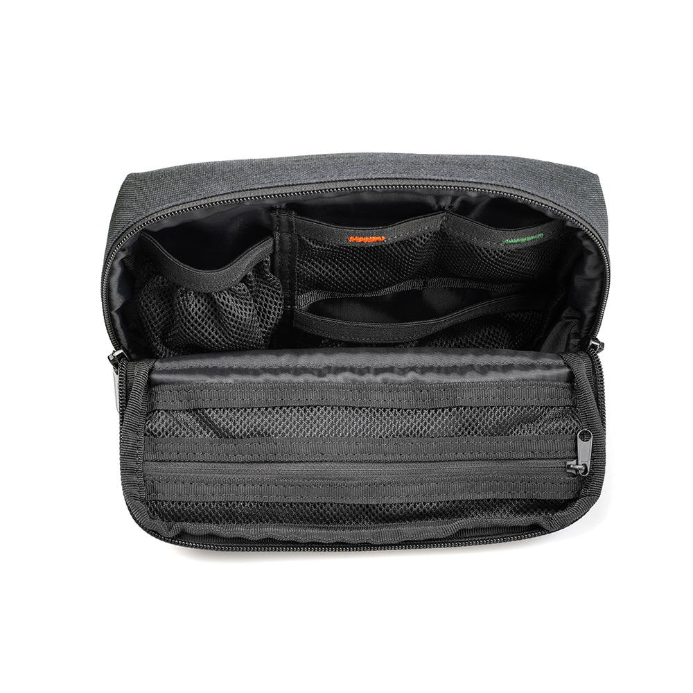 スマートフォンで本格的な撮影を行うときに必要なコンバージョンレンズやミニ三脚、LEDライトなどをまとめて収納することができるマルチガジェットポーチです。内部には細かい仕切りやネット、ゴムが配置されており、収納するものに合わせて自由にレイアウトを決めることができます。どんなシーンにも合わせやすい、スッキリとしたデザインも特長です。