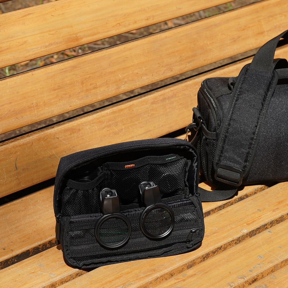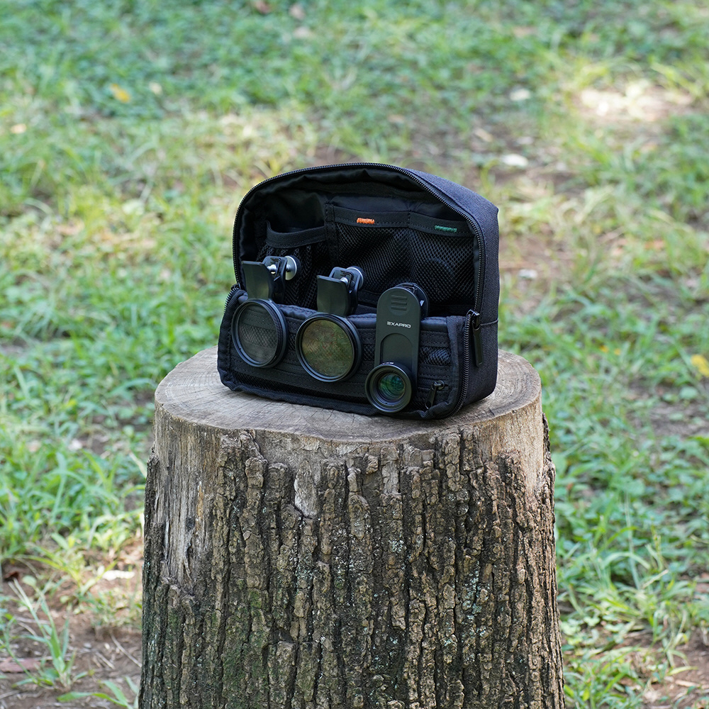 EXAPROシリーズのクリップレンズやフィルタークリップ、マグネティックモバイルスタンドなどを同時に収納可能です。クリップレンズは、ポーチ内部のゴムに引っ掛ける形で安定して収納することができます。