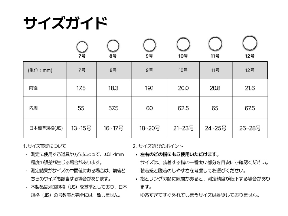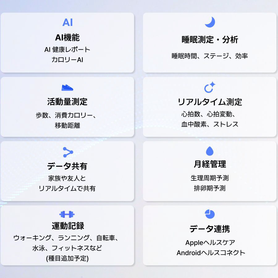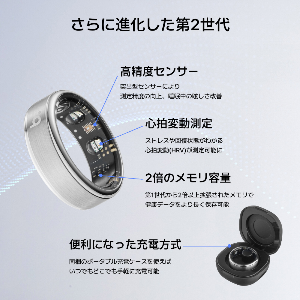 AI機能(AI健康レポート、カロリーAI)、睡眠測定・分析(睡眠時間、睡眠ステージ、睡眠効率)、活動量測定(歩数、消費カロリー、移動距離)、リアルタイム測定(心拍数、心拍変動、ストレス、血中酸素)、データ共有(家族や友人とリアルタイムで共有)、月経管理(生理周期予測、排卵期予測)、運動記録(ウォーキング、ランニング、サイクリング、水泳、フィットネスなど)、データ連携(Appleヘルスケア、Androidヘルスコネクト)データ処理は日本国内のサーバーにて行われるため安心・IP68+5ATM防水・スマホと安定的につながるBluetooth5.2使用・約90分の充電で最大7日間使用可能。キズや衝撃にも強いステンレススチール製。肌にも優しく滑らかにフィット。本製品は、一般的な装飾品のリングとはサイズ感が異なります。リングをご購入前に、別売りのサイジングキットをご購入いただき、サイズの採寸をお願いします。(リングご購入後のサイズ違いでの交換・返品は承ることが出来ません。)