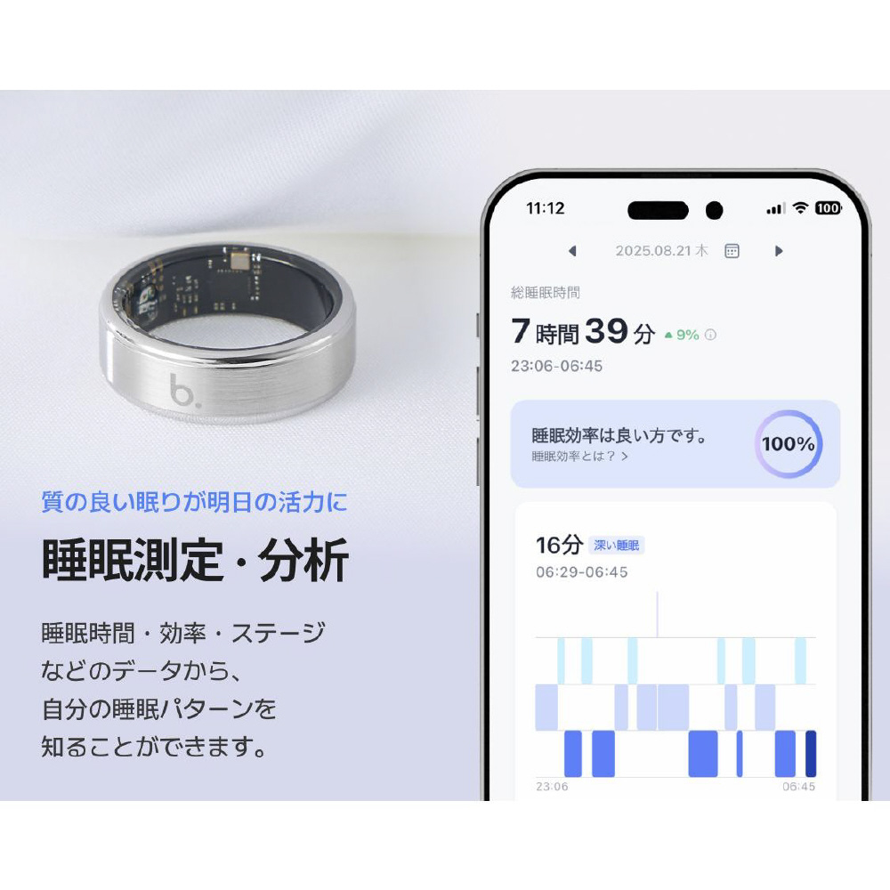 b.ringは、つけてるだけで生体情報を分析し毎日の健康をサポートするスマートリングです。日常生活に最適な着け心地とスタイリッシュなデザインが特徴です。リアルタイムで健康管理・・・ブリング専用アプリで心拍数、睡眠データ、運動データなどさまざまな健康データを一目で確認!いつでもどこでも、簡単に健康状態をチェック、管理できます。ブリングで手軽に健康的な毎日を築きましょう。