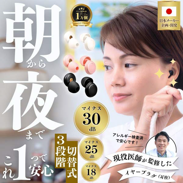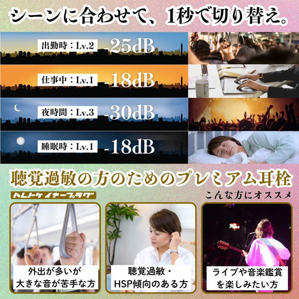 通勤・仕事・リラックスタイム・睡眠など、一日を通して音のストレスから耳を守るために設計されたプレミアム耳栓です。