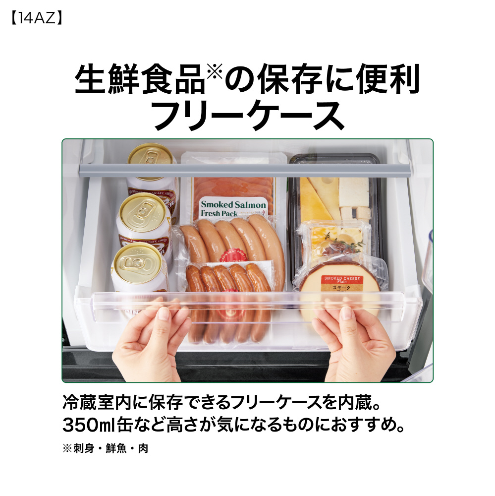 冷蔵室内に保存できるフリーケースを内蔵。350ml缶など高さが気になるものにおすすめ。