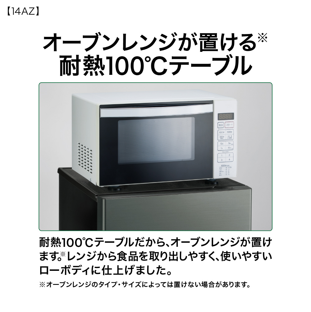 耐熱100℃テーブルだから、オーブンレンジが置けます※。レンジから食品を取り出しやすく、使いやすいローボディに仕上げました。