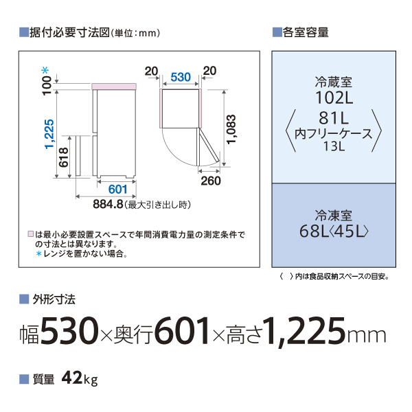 冷蔵室容量 102L