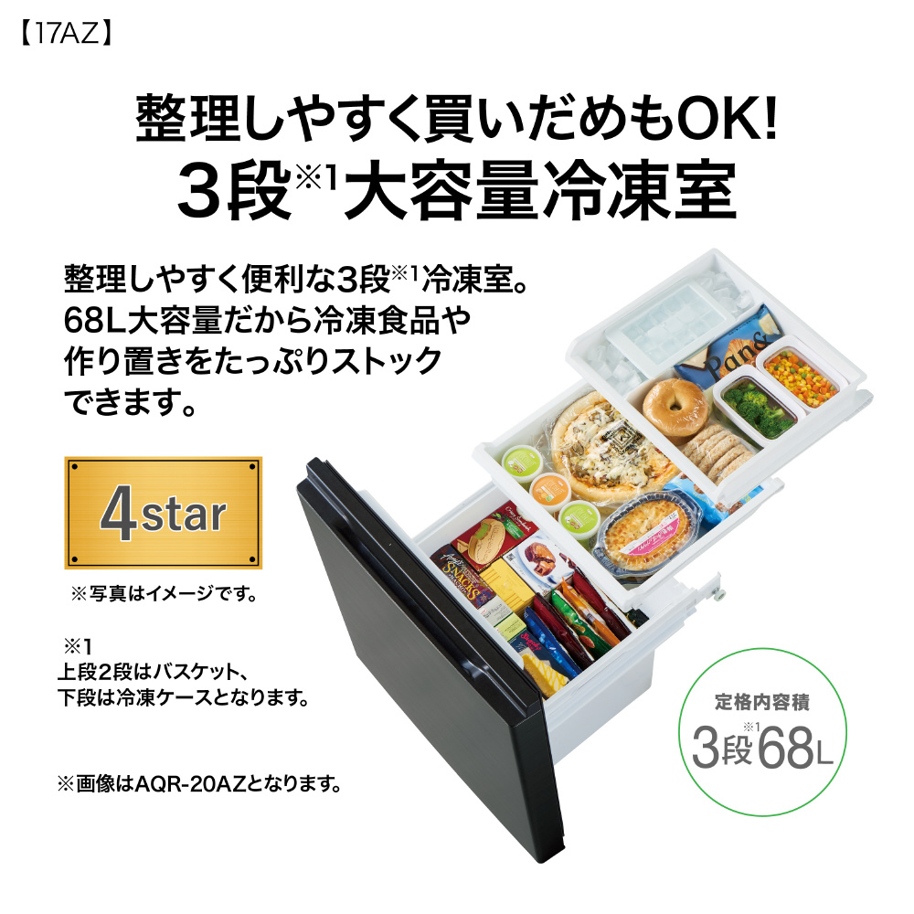 大容量68L 3段構造の引き出しタイプの冷凍室採用、170L 2ドア冷蔵庫。