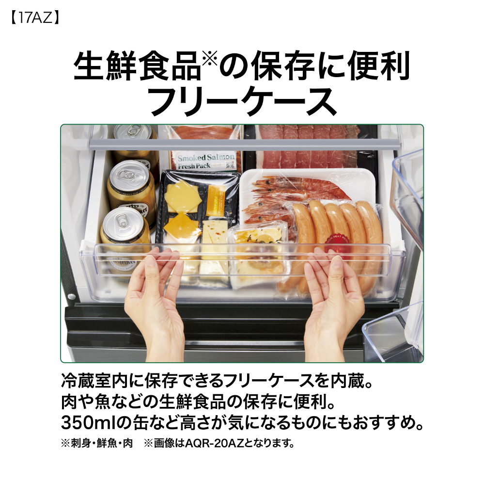 冷蔵室内に保存できるフリーケースを内蔵。肉や魚などの生成食品の保存に便利。350mlの缶など高さが気になるものにもおすすめ。