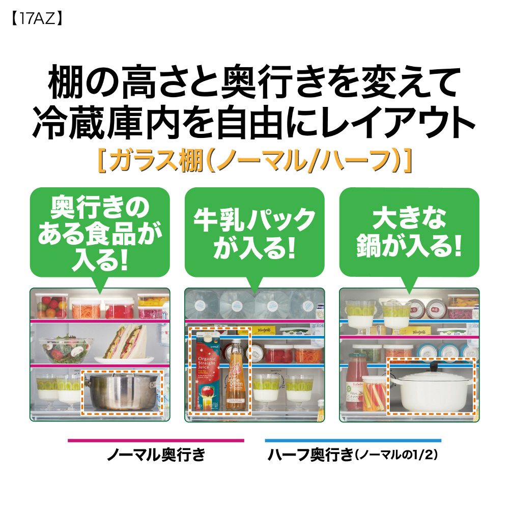 ■棚の高さと奥行きを変えて冷蔵庫内を自由にレイアウト「ガラス棚(ノーマル/ハーフ)」