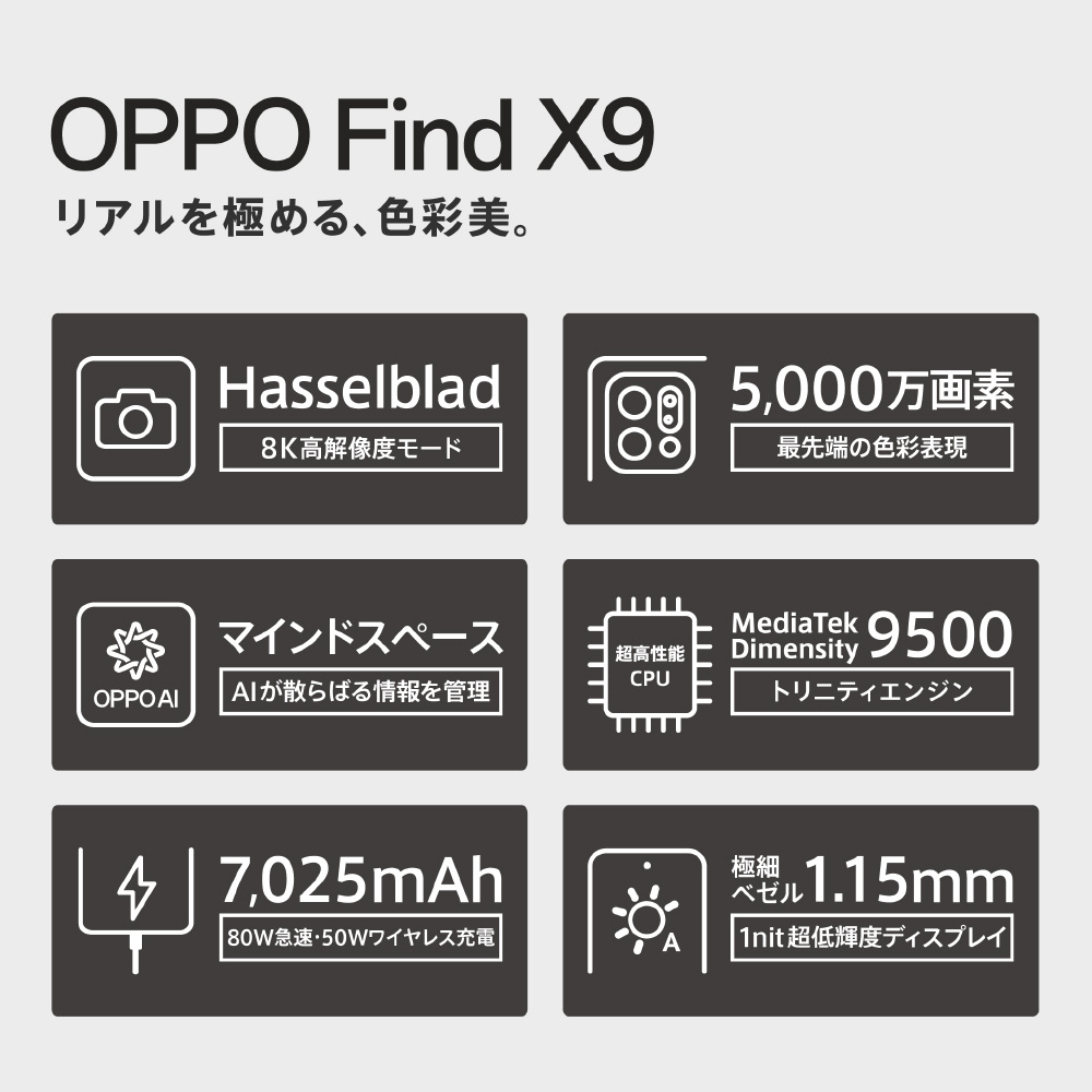 【SIMフリー】OPPO Find X9 チタニウムグレー「CPH2797 GY」MediaTek Dimensity 9500 約6.6インチ・メモリ/ストレージ:16GB/512GB nanoSIM ×2 【防水・防塵】 おサイフケータイ対応 チタニウムグレー