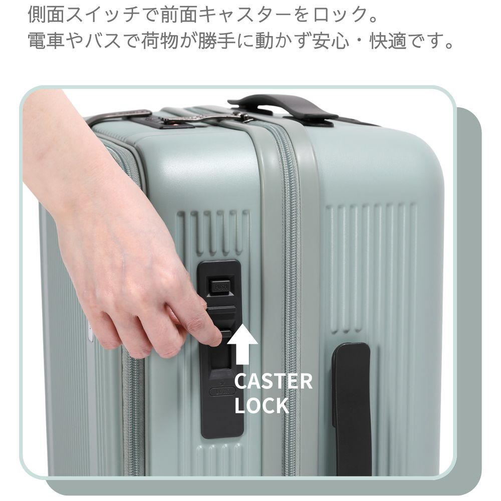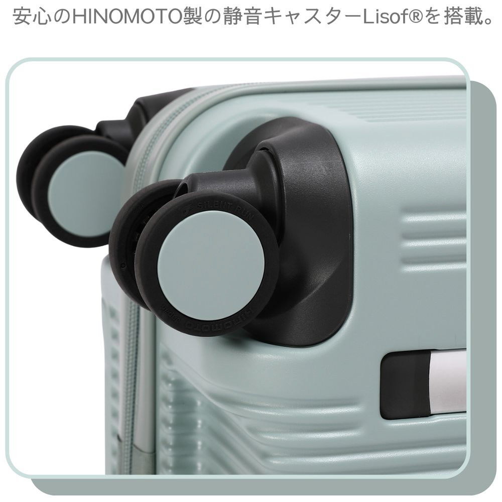 キャスターには、HINOMOTO製「Lisof(R)」静音ダブルホイールを採用。滑らかな走行性に加え、ストッパー機能付きで電車内や坂道でも不意な動きを防ぎ、快適で安心な移動を実現します。TSAロック対応のツインロック仕様により、フロントポケットとメインルームを同時に施錠できる点も魅力です。