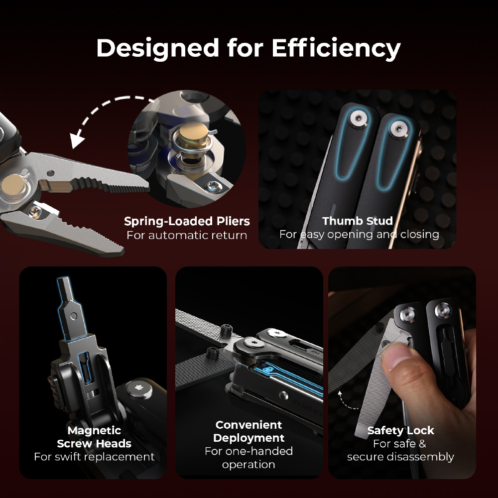 ・ナイフ、ヤスリ、レンチが外部に取り付けられているため、緊急の調整の際に片手で素早く展開できます。
