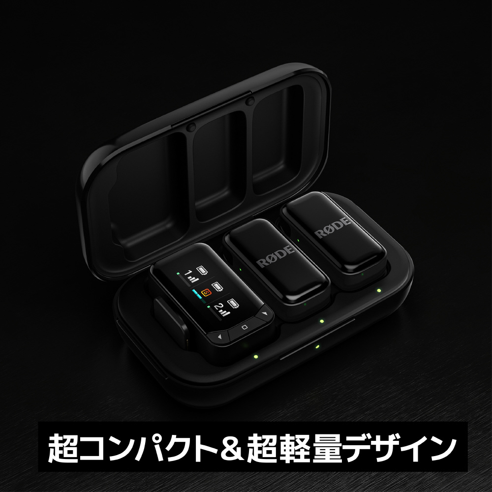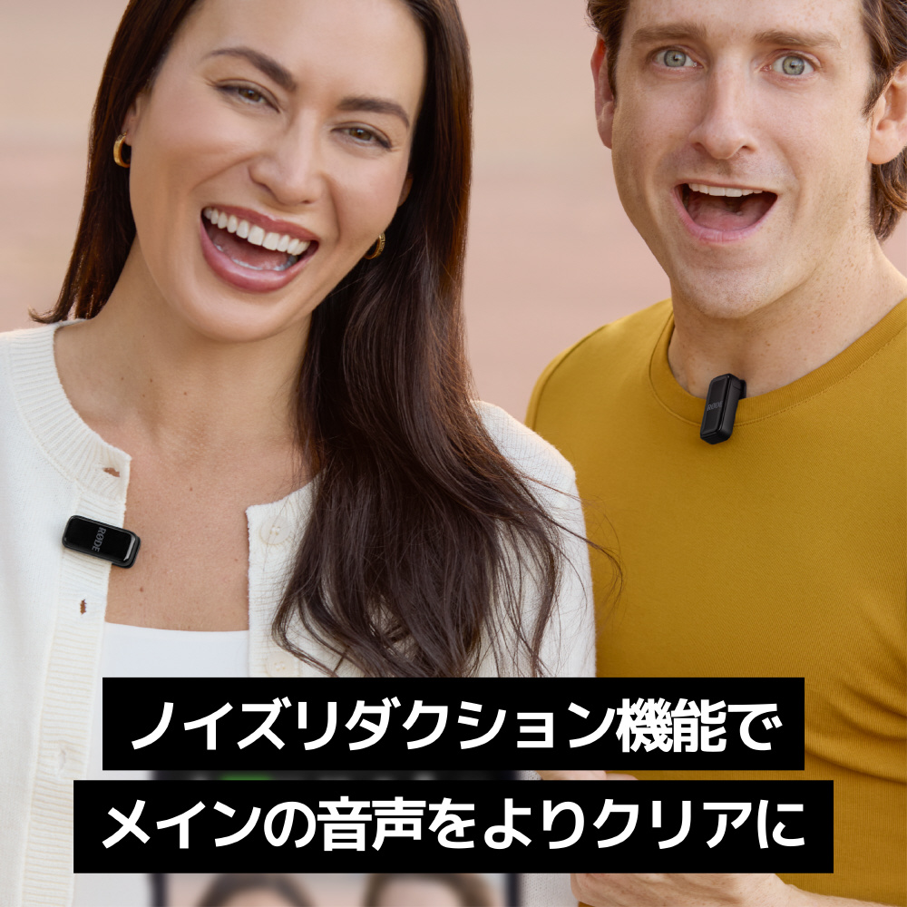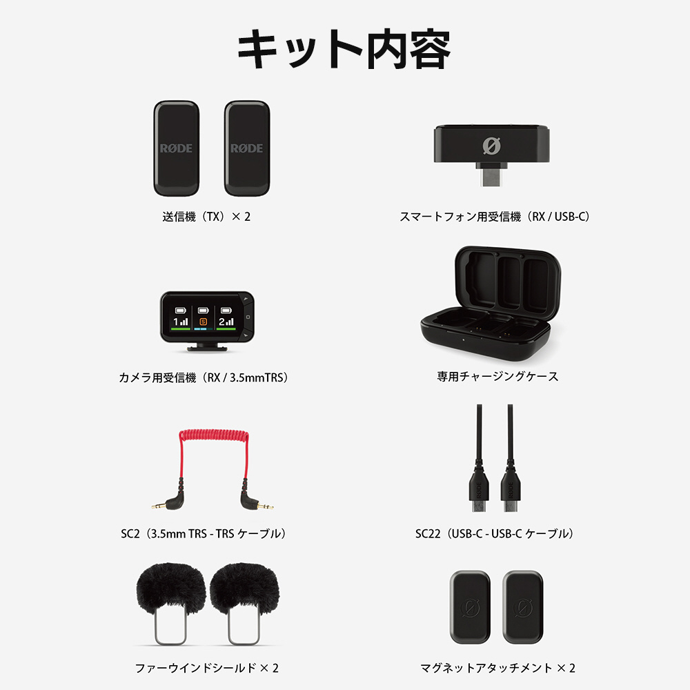 高音質なマイクを内蔵した2つの送信機は、ケースから取り出すと自動的に電源が入ります。また、スマートフォン(USB-C端子)に直接つなげる超小型受信機と、3.5mmTRS端子でカメラに接続できるオンカメラタイプの受信機がセットになっています。